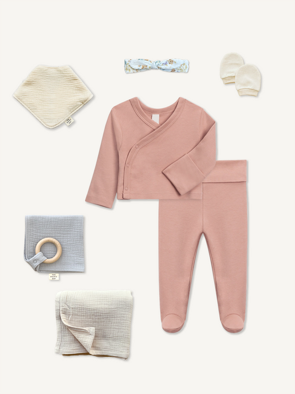 Classic, cozy and soft outfit set in pure organic cotton jersey. All the small things that a newborn baby needs. The basic colors are perfect for mix & matching. Comes in a cute gift box.