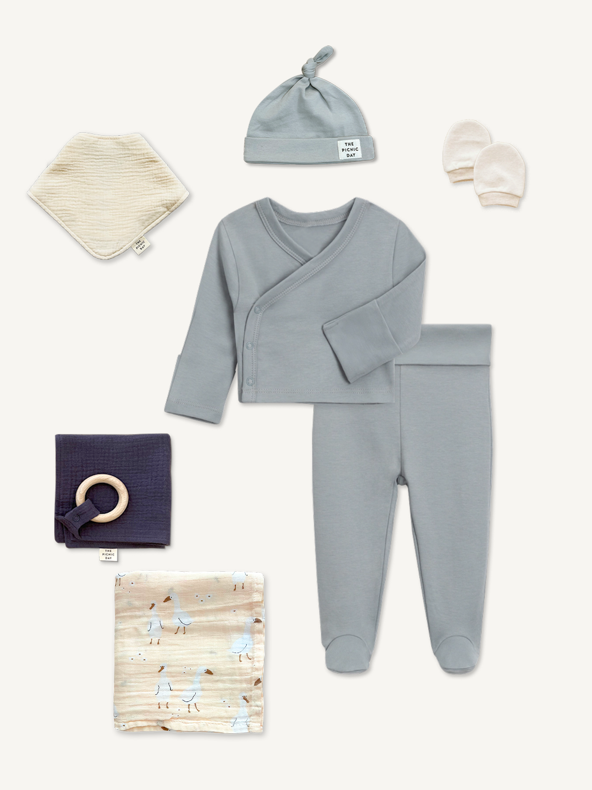 Classic, cozy and soft outfit set in pure organic cotton jersey. All the small things that a newborn baby needs. The basic colors are perfect for mix & matching. Comes in a beautiful gift box.