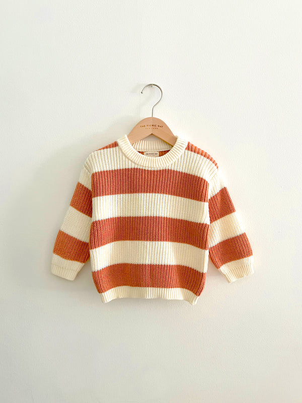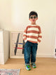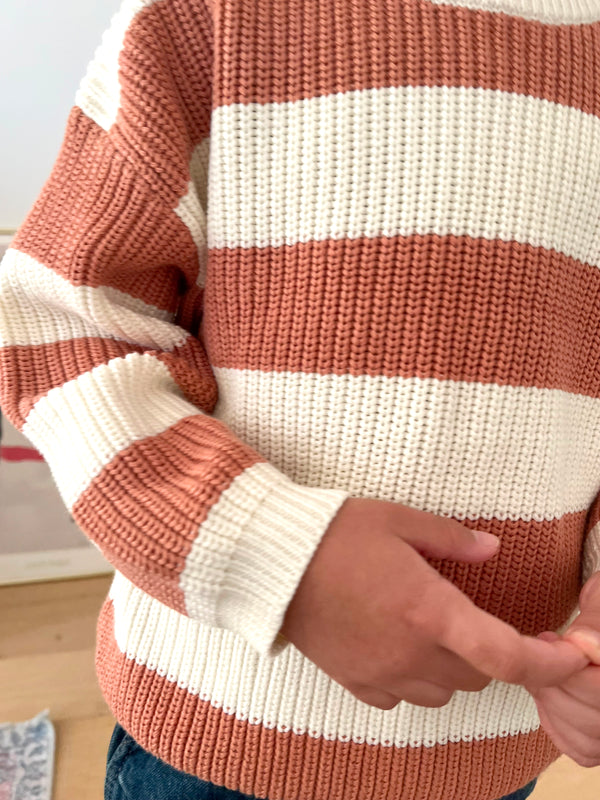 Created with little kids in everyday life on mind, this cotton chunky knit is super comfy and cozy. The warm tone stripes go well with any bottom. Static free. Machine washable. Oversized for an adorable look :)