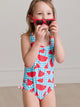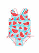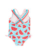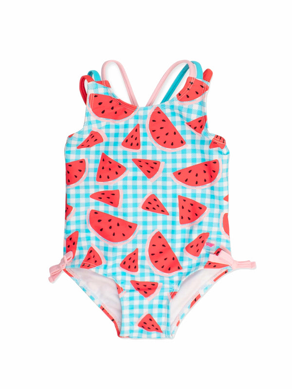 This sporty yet sweet style is perfect for all-day play! The UPF 50+ fabric offers superior sun protection, and the multi-color straps and bow accents at the legs add a girly touch. Nothing screams summer like classic gingham with vibrant watermelon slices!