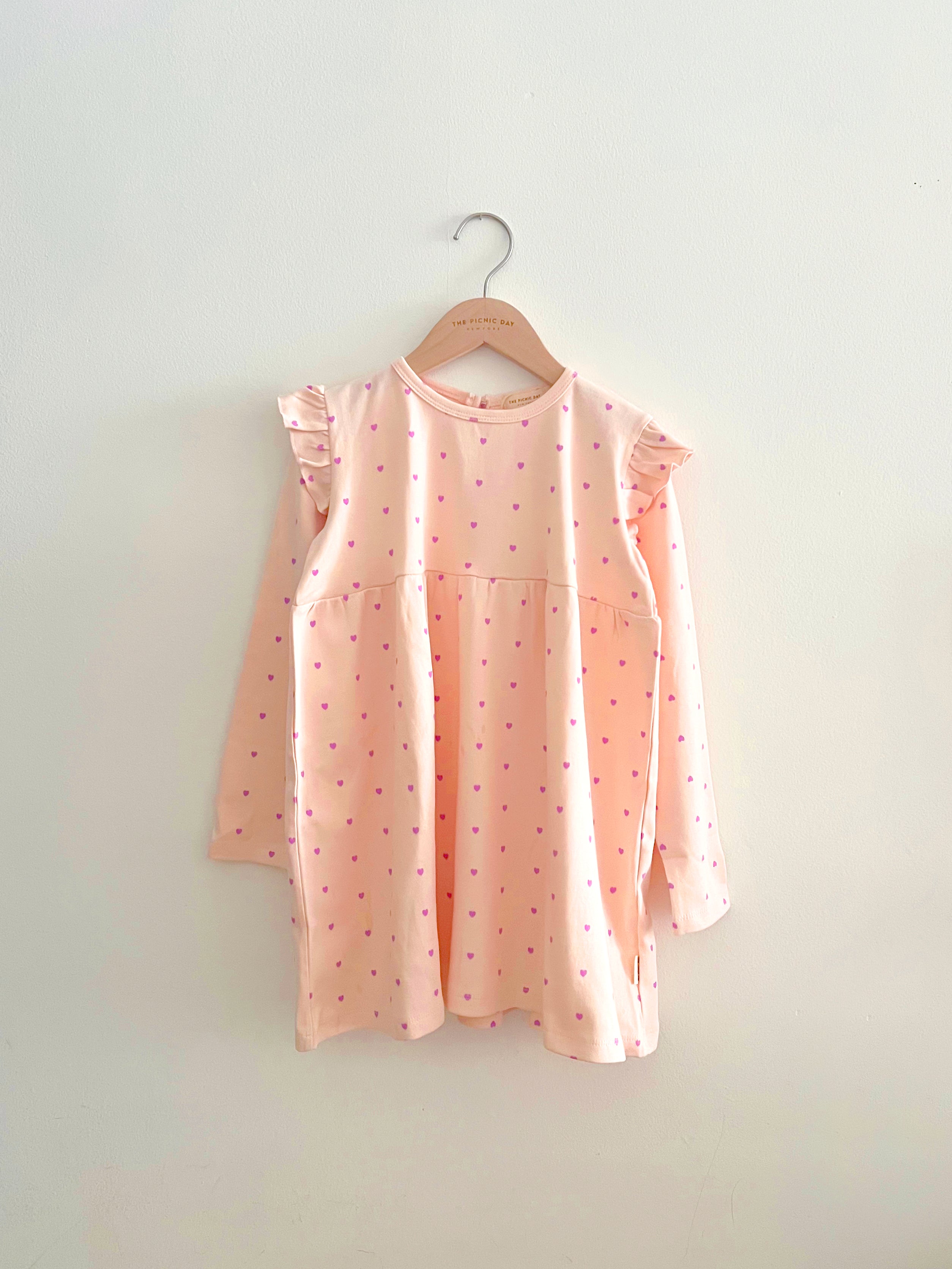 This Heart Printed Ruffle Dress is perfect for everyday activities. Made with organic cotton material, it is stretchy and breathable providing all day comfort. The same color baby rompers available for matching outfit <3