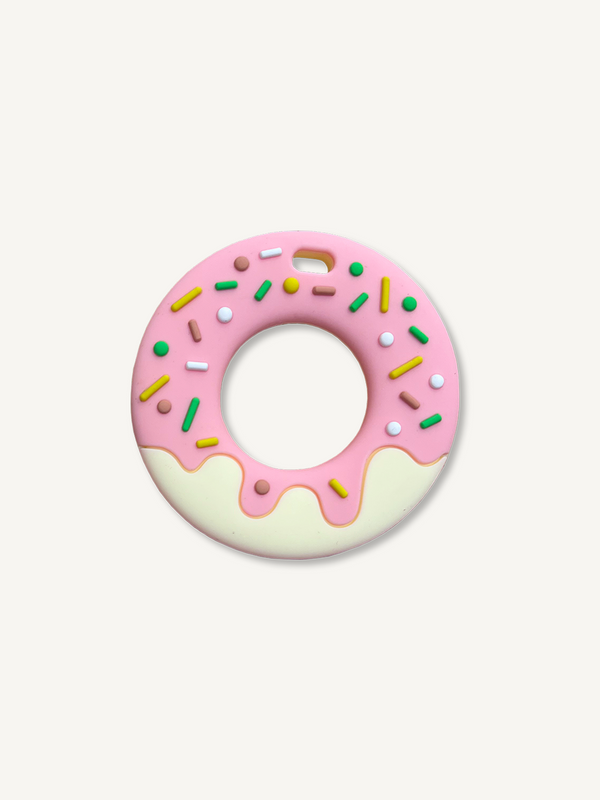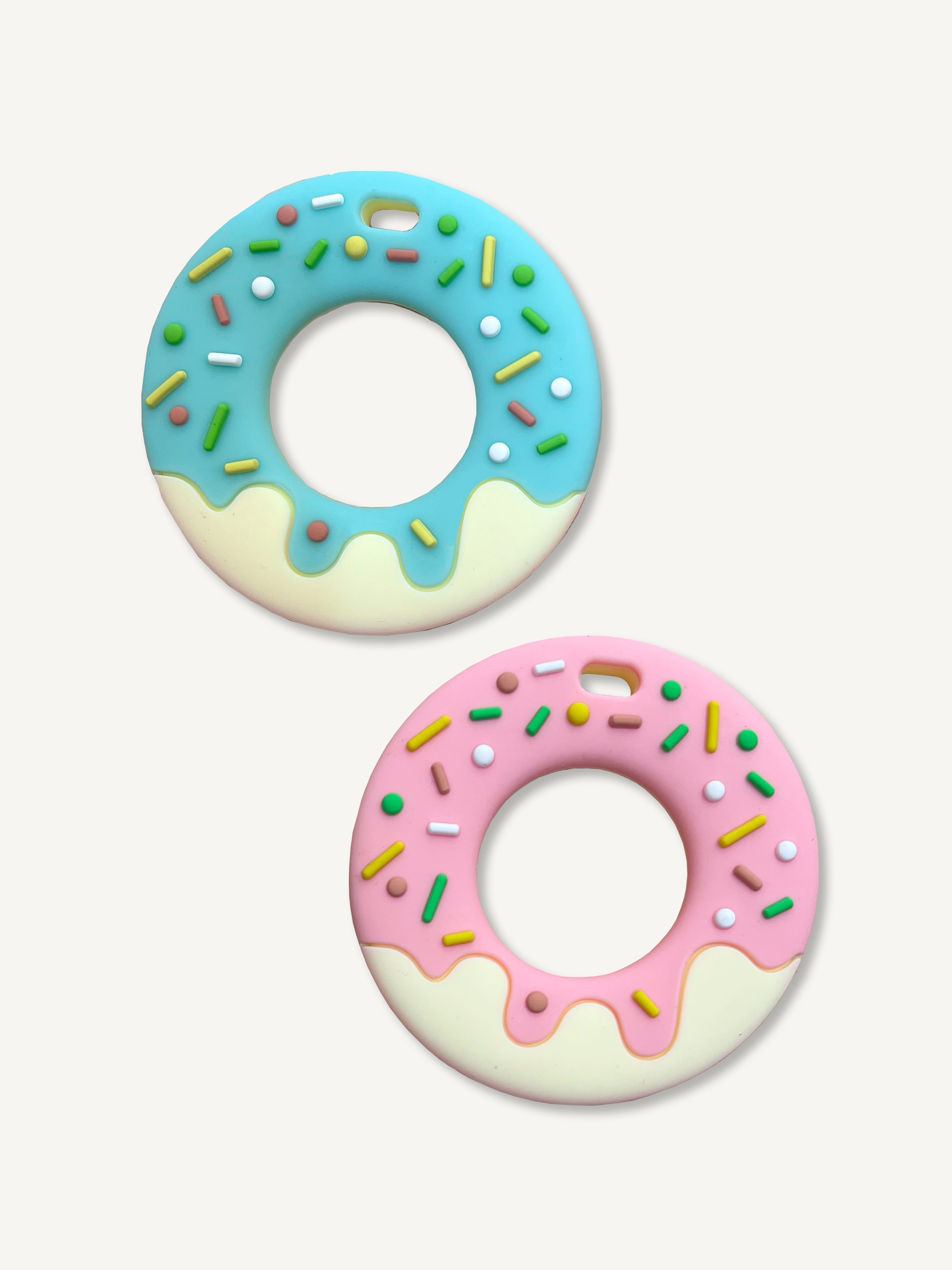 This Donut Teether is easy to hold for little hands. There is a small hole to attach a pacifier clip. Time for a cute pic!