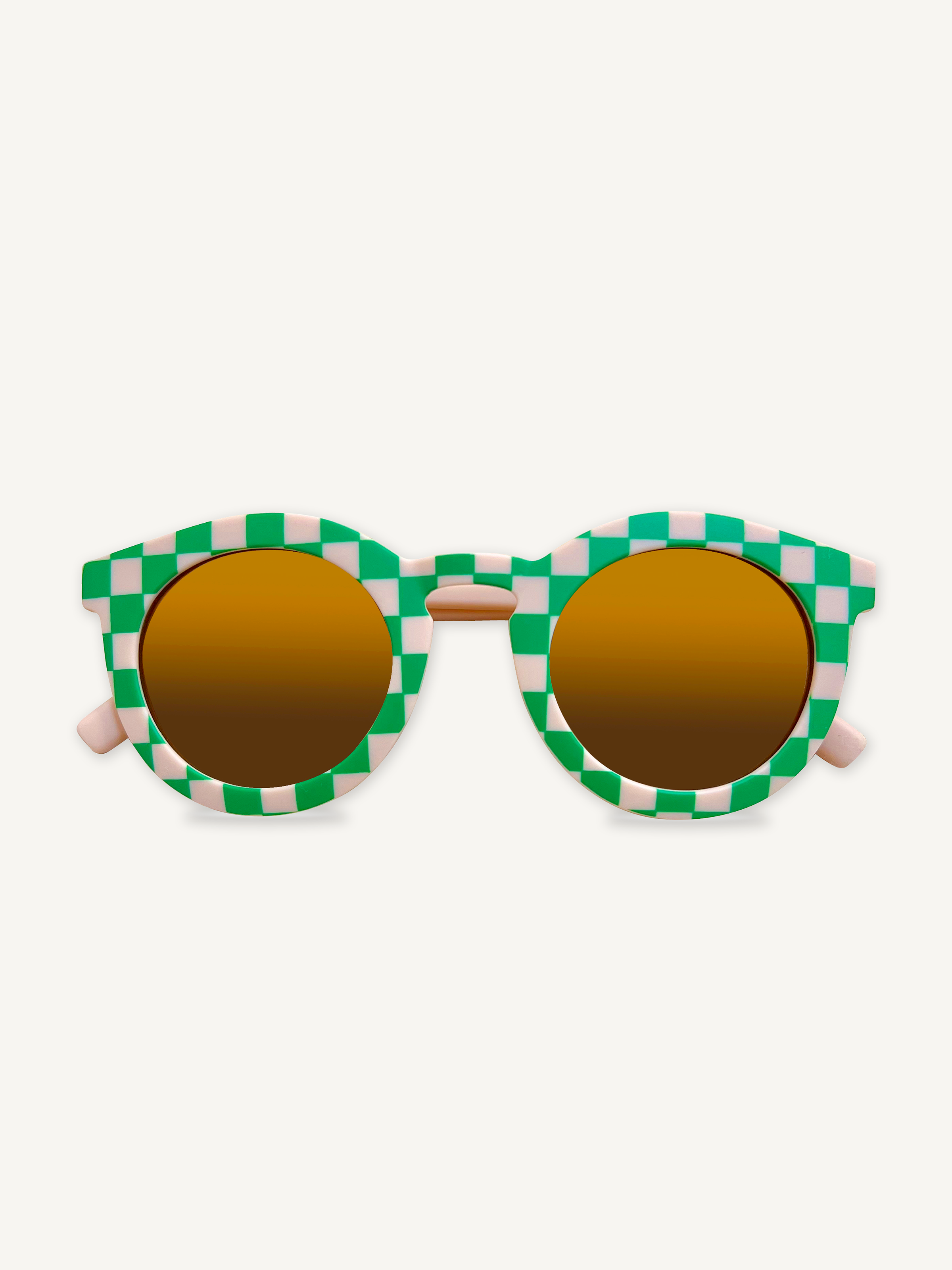 Chic sunglasses with checkered pattern. Make your kids stylish and UV protected just like we are! Round frame with matte texture. Fits most kids 0-8 years. UV400 protection.