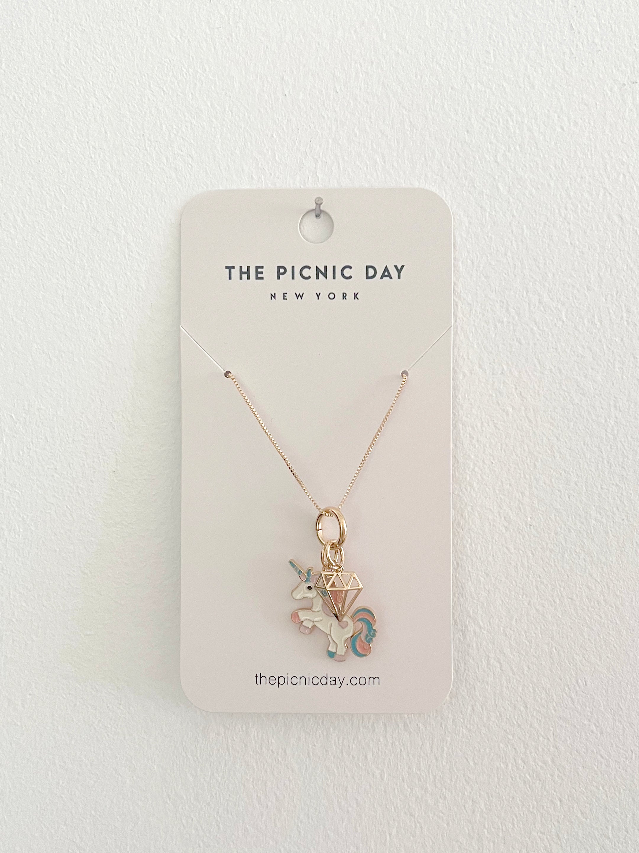 Enamel unicorn charm necklace with gold chain. About 17-20” (45-52cm) Adjustable length.