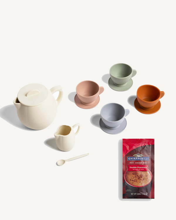 The silicone tea set is made from soft silicone and is great for role play and imagination. 12-piece set includes: Tea pot with lid, 4 tea cups and saucers, one milk jar, and a spoon.