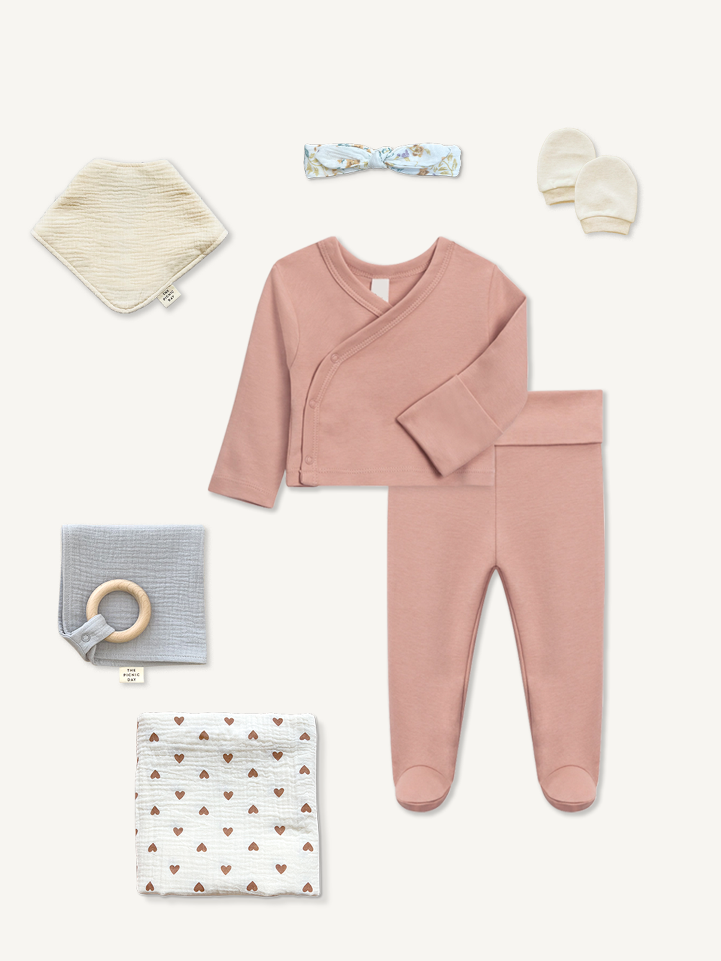 Classic, cozy and soft outfit set in pure organic cotton jersey. All the small things that a newborn baby needs. The basic colors are perfect for mix & matching. Comes in a cute gift box.