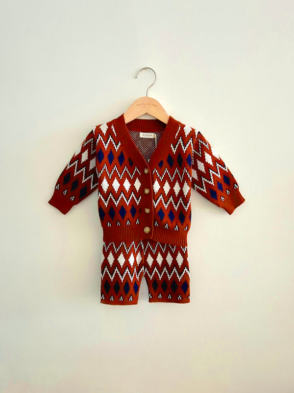 Super thick and cozy knit set with cool pattern. With the beautiful marble colored buttons it is something that we big people would want to wear :)