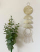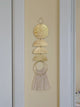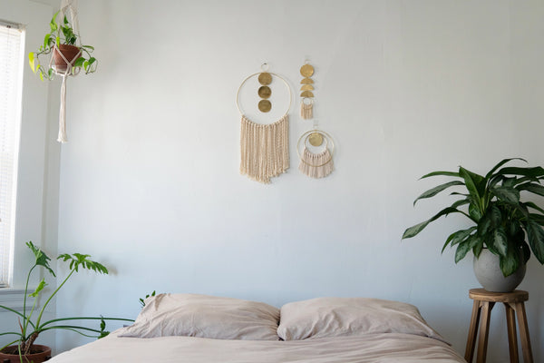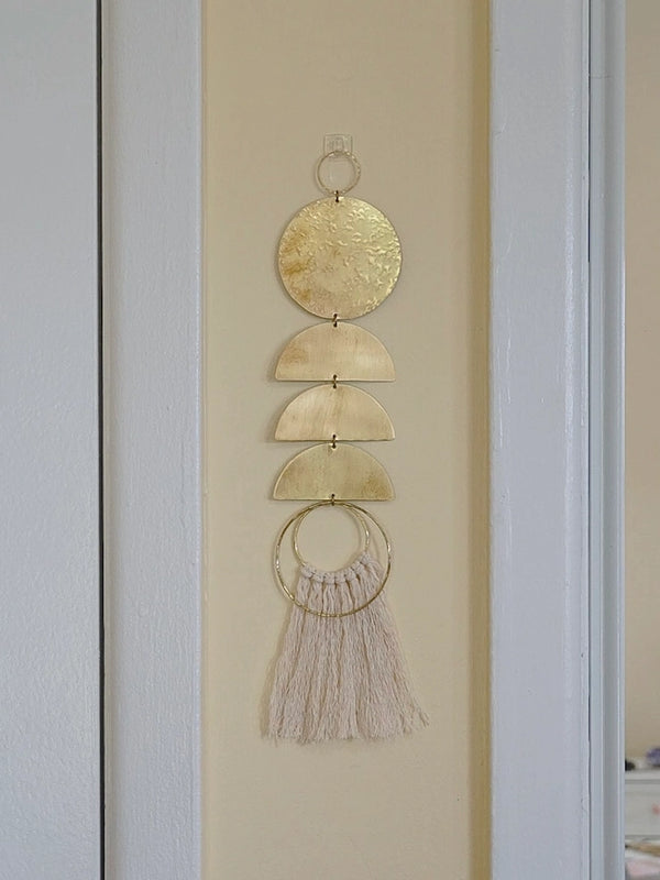 This geometric wall hanging features beige cotton cord fringe for a mixed media look. Brass shapes have been hand formed and come together for the perfect minimalist wall hanging. All brass open circles have been hammered for texture while semi circles have been left un textured.