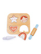 This wooden cookie cutter toy comes with a tray with shape-sorting cut outs, 4 illustrated pretend cookies, a toy rolling pin, and a pretend icing bag. Age range: 2 years+