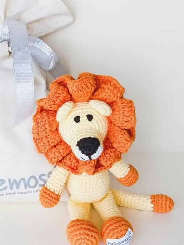 Handmade, crochet stuffed animal lion Entirely hand-crocheted in GOTS organic cotton yarn by our artisan women. Made with GOTS organic cotton yarn, Hand crocheted, stuffed with hypoallergenic stuffing Age: 0-onwards Conforms to toy safety standards Comes in an individual cotton pouch with ribbon and a card with the name of the artisan who made the toy.