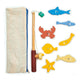 This toy includes a wooden fishing rod with magnetic end to attract 7 sea creatures. All held in a zipped pencil case-styled bag with blue wave interior. A starfish, a crab, a shark, a flat fish, a herring, a cod and a mackerel, all with numbers printed on the back.