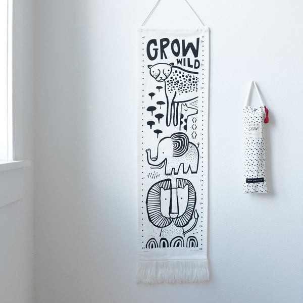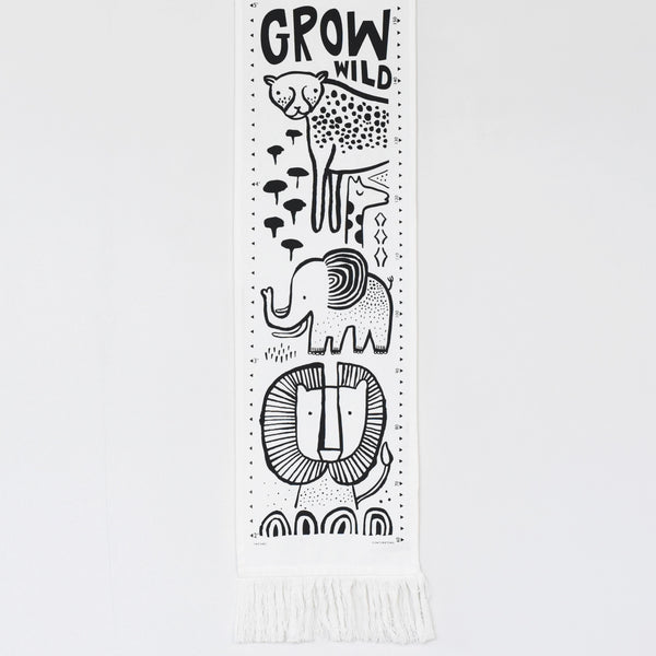 This fabric Growth Chart features safari animals that smile as your little one grows. Ethically and sustainably made in India using screen printing on organic cotton canvas, finished with a waxed cotton twine hanging cord and stylish fringe end. Comes in a special keepsake bag with a place for your child's name and birth date. Measurements include both inches and centimeter markings. The perfect accent to your nursery or children's room decor.