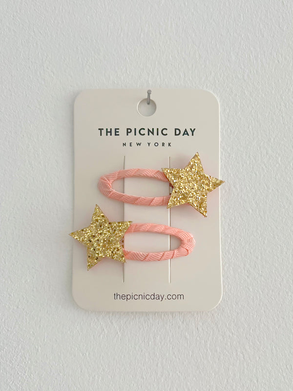 A sparkly pair of hair clips to elevate your mini's outfit. With the pink contrast fabric, it spreads fun vibes.